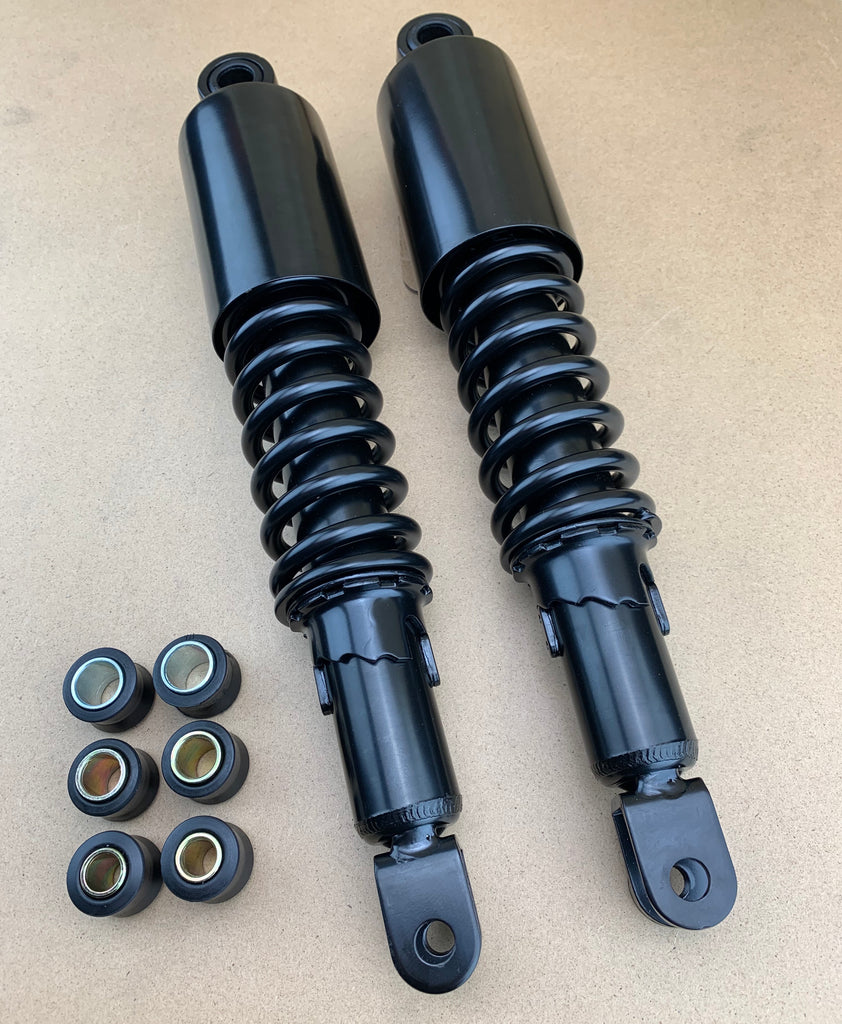 Ils ont des points de montage de broche/fourche de 335 mm et un carénage de 100 mm. La goupille/douille supérieure est de 15 mm, la fourche inférieure est de 10 mm/filetage M10. (Vous devrez peut-être changer la douille supérieure à la taille requise) . Veuillez vérifier les mesures par rapport à vos originaux avant l'achat pour vous assurer que vous serez satisfait de ce que vous recevrez et de tout travail qui pourrait être nécessaire.