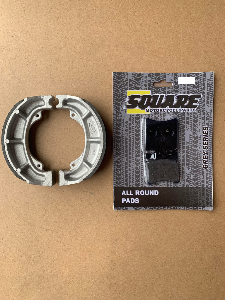 Ce jeu de plaquettes de frein avant et de mâchoires de tambour de frein arrière a été fabriqué pour remplacer les jeux de freins d'origine sur une Suzuki AP50. pour les années et les modèles indiqués ci-dessus.